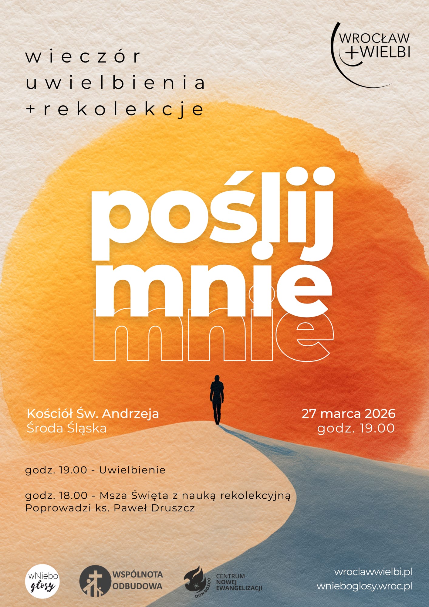 Zapraszamy Was na wieczór uwielbienia POŚLIJ MNIE, który zakończy rekolekcje parafialne w parafii św. Andrzeja Apostoła w Środzie Śląskiej prowadzone przez księdza Pawła Druszcza. Razem z nami będzie posługiwać wspólnota ODBUDOWA, dzięki czemu będziecie mogli skorzystać z modlitwy wstawienniczej.